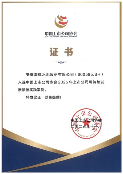 2025年11月18日,中國(guó)上市公司協(xié)會(huì)在北京召開(kāi)了第三屆理事會(huì)第六次會(huì)議和2025上市公司可持續(xù)發(fā)展大會(huì),大會(huì)舉行了“2025董事會(huì)最佳實(shí)踐案例”“2025可持續(xù)發(fā)展最佳實(shí)踐案例”發(fā)布儀式,海螺水泥同時(shí)榮獲“2025董事會(huì)最佳實(shí)踐案例”和“2025上市公司可持續(xù)發(fā)展最佳實(shí)踐案例”。