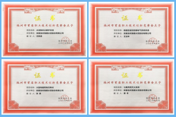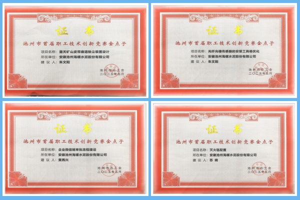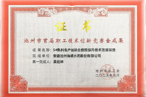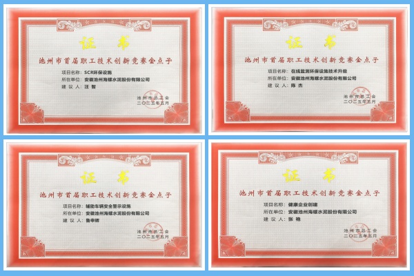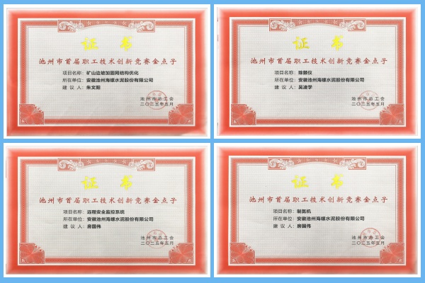 2025年11月,池州海螺榮獲池州市總工會(huì)頒發(fā)的多項(xiàng)證書嘉獎(jiǎng),以表彰在池州市首屆職工技術(shù)創(chuàng)新競賽中所取得的優(yōu)異成績。